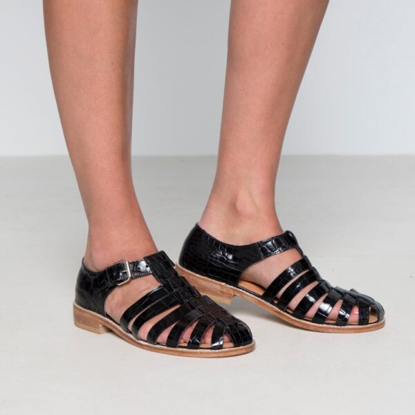 Handgefertigte Ledersandalen im Fischer-Stil mit einer riemenbedeckten Vorderseite. Mit Präzision und Sorgfalt in Litauen gefertigt.
